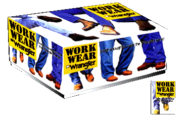 WRANGLER BOOT BOX & TAG This brand name is known world-wide, and so it was decided that to maximize the tie-in with their jeans, the footwear line would show jeans on the box and tag. Another subliminal visual feature was using a warm yellow in the graphics, which resembled the stitching in their clothing.