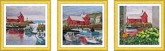 MOTIF #1, SERIES: Watercolors. Cape Ann has many beautiful scenes that beg to be painted, but none more so than that of Motif #1, Rockport's ubiquitous landmark. I approached the subject from that of a wandering tourist, capturing glimpses from unusual vantage points – from an alleyway, behind a building and through the window of a gift store. SOLD