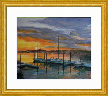 SUNSET AT PIRATE’S LANE: A beautiful Gloucester harbor sunset taken from the parking lot of the Cape Ann Art Association. This watercolor was, painted from a series of sunset photographs over water.